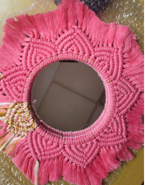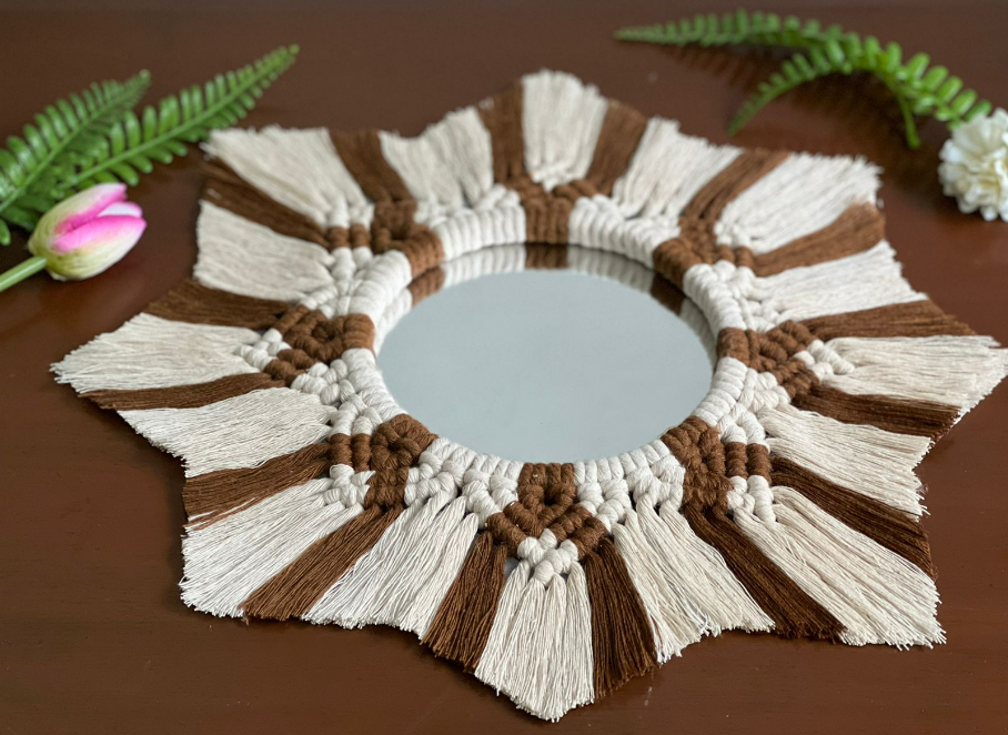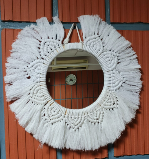 The round macrame wall hanging mirror adds dimension to a space in your home. It will bring Bohemian folk and vintage to your decor. Can be placed alone or stacked with others, it goes great with a rattan mirror. It’s an ornate wall mirror perfect for home decor in a vintage rustic style